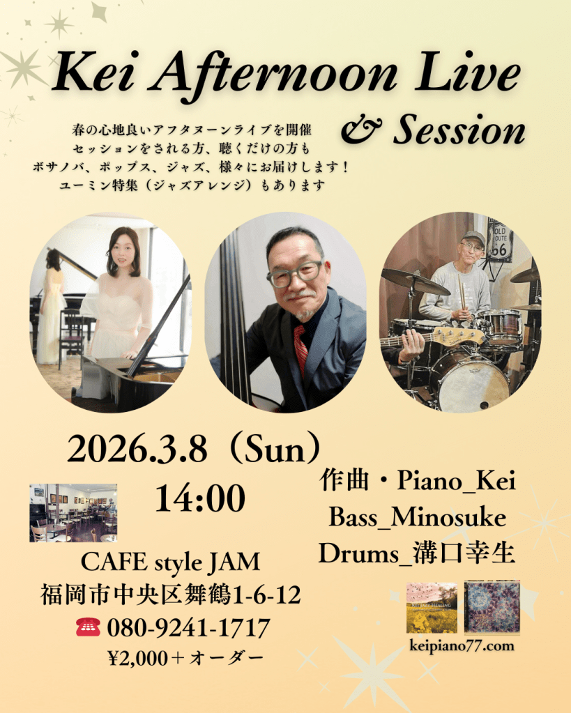 ジャズ、ポップス、フュージョン等のライブコンサートとまた【音楽療法士、安眠インストラクター】等の活動も行っています。4/25 福岡市中央区のPIANOGARDENさまにて、楽しいトーク&ライブ!